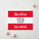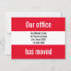 This bright and white moving announcement has three fields. Together the red fields say 'Our office has moved'. You can edit the black text in the white field to customize your postcard with your company's name, address, and phone number.