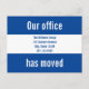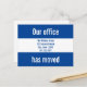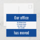 This deep blue and white postcard has three fields. Together the blue fields say ' Our office has moved'. Use the white field to customize your postcard with your company's name, address, and phone number. The text is also deep blue. Deep blue is hex code #004095.