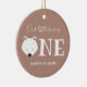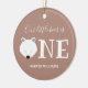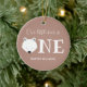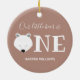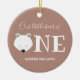 An our little bear is one first baby birthday keepsake ornament. The ornament is light brown and white with the word "One" in large letters with a polar bear face illustration as the first letter of the word. Simply, customize it, add it to your cart, and add it to your tree.