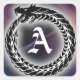 Black symbolic Ouroboros - the dragon biting its own tail - representing the passing of seasons, renewal and rebirth. The dragon is depicted on a mystical purple and blue background and has a magical white glow. Features a customizable monogram letter in gothic style Old English font in the centre.