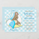 Cette mignonne invitation au baby shower présente un adorable et somptueux petit ours en peluche marron avec un casquette rayé bleu et blanc et des couvertures bleues et jaunes. L'image est encadrée dans un cercle mince de lignes brunes, et placée contre un arrière - plan en vichy bleu et blanc. Il y a un champ de texte personnalisé en bleu foncé en haut et en bas, et vos informations sont en bleu et en marron à droite. L'arrière de l'invitation est assorti au bleu solide. Assurez-vous de voir les produits correspondants dans notre magasin.