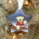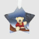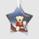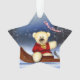 Un mignon ourson sur un traîneau dans un paysage enneigé.