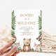 Bear Woodland Wild One 1st Birthday Invitation Jolie invitation d'anniversaire pour les garçons à thème boisé avec un ours, loup, renard, raton laveur et porc-épic. Cette invitation à un 1er anniversaire de forêt sauvage comprend également des pins et des feuillages.