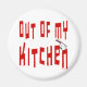 Out of my Kitchen saying for cooks with an attitude, moms with Momitude and those slaving over a hot stove everywhere. Fun food slogan in blood red scratchy letters with a meat cleaver in the 'N'