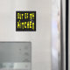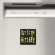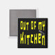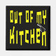 Out of my Kitchen saying for cooks with an attitude, moms with Momitude and those slaving over a hot stove everywhere. Fun food slogan in blood red scratchy letters with a meat cleaver in the 'N'