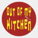 Out of my Kitchen saying for cooks with an attitude, moms with Momitude and those slaving over a hot stove everywhere. Fun food slogan in blood red scratchy letters with a meat cleaver in the 'N'