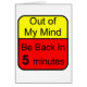 Out of my mind. Be back in 5 minutes. A bright yellow and red caution sign stating the state of your mind. A funny t-shirt lets others know that you occasionally step out for a couple of minutes. Not to worry, you'll be right back.