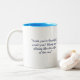 11 oz two tone blue on white ceramic mug featuring the cover of Josh's "Out Of The Blue" and a quote from the book.