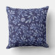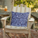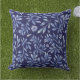 This outdoor accent throw pillow is shown with a lovely navy blue and blue watercolor botanical print.