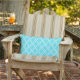 This outdoor accent throw pillow is shown with a lovely turquoise and white Moroccan print design.