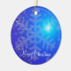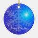 Outdoor Christmas ornaments with picture of snowflakes on blue background and customizable text.