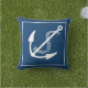 Outdoor throw pillow shown in navy and white with a anchor print and has a solid red back side.