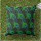 This outdoor throw pillow is shown in black with a pretty peacock feathers print.