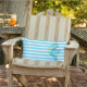 Throw outdoor pillow shown with a cute turquoise blue and white stripes print design with a seahorse.
