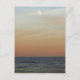 Haze softens the colours of sunset as the moon rises over a quiet sea.