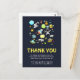 Party thank you postcard with a cute and colourful pattern with all kinds of outer space themed elements. Images include astronauts floating around in their white space suits. Stars and planets and cool little rocket ships, spaceships, and satellites. Fun and crazy design.