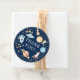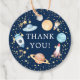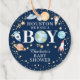 Cute space baby shower favour tag featuring planets, rockets & stars set on a blue background.