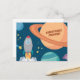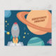 Postcard with a fun outer space design with planets, rocket, and stars. It has text saying Greetings Friend but can be personalized.