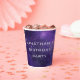 Serve drinks in style with these personalized galaxy birthday paper cups featuring a deep purple cosmic space background with stars and nebulae and modern futuristic lettering. Perfect for a space themed birthday party, planetarium celebration, astronomy party, or science and STEM themed kids birthday. These disposable paper cups are ideal for creating a complete outer space party table setting for boys or girls.