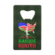 Ouvrage de bouteille basque américain Roots. Carte des Etats-Unis avec drapeaux du Pays basque et américain mélangé avec le texte Roots basques en rouge et vert.