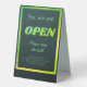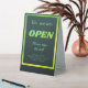 Ouvrez une fenêtre dans des couleurs noires vertes et tendance. Les heures d'ouverture et les textes peuvent être customisés ou supprimés.