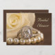 Invite guests to a pre marriage party honouring the bride to be with the elegant Oval Diamond Ring and White Rose Bridal Shower Invitation. This classy custom wedding shower invite features a close up floral photograph of an oval diamond engagement ring, white pearl necklace and white rose flower blossom on a brown silk background.
