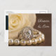 Announce your upcoming nuptials with the elegant Oval Diamond Ring and White Rose Wedding Save the Date Announcement Postcard. This classy custom marriage keep the date card features a close up photograph of an oval diamond engagement ring, white pearl necklace and white rose flower blossom on a brown silk background.