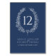 Elegant oval wreath leaf in white on dark navy blue with white text wedding table number. Edit this card with your own names and wedding details and table number. You must change the number to each table number that you need and add them to your cart, one at a time. Quantity discounts may apply once you add all the items to your cart. Other matching items are available. Designed by www.mylittleedenweddings.com