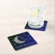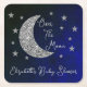 Over the moon baby shower with silver moon and stars against a black and blue night sky background