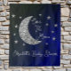 Over the moon baby shower with silver moon and stars against a black and blue night sky background