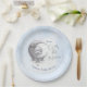 We are over the moon elegant celestial baby shower paper plates in blue and silver grey with a lovely moon and the baby face, diamonds and stardust. Boy baby shower tableware, easily personalize the text. - Kate Eden Art