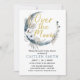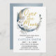 This invitation features a moon with boho elements with the phrase "Over the Moon". Dusty blue colour and gold lettering.