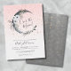 Over the Moon Baby Shower Invitation. Celebrate a magical moment with this whimsical boho celestial baby shower theme. "Over the Moon!" is prominently displayed within a crescent moon on a baby pink to white gradient background, which can be customized to any colours. An elegant yet playful look with a watercolor crescent moon, gold stars, and white anemone flowers, feathers, and other accents that give a bit of a bohemian vibe. The back features a grey starry night watercolor. The design showcases a pink, black, white, gold (no shimmer or foil), and grey colouring overall. The text is presented in an elegant mix of script typography and a serif font in black. This invitation is perfect for celebrating the mother-to-be and adds a mystical touch to your special day. Simple Stylish Elegant Watercolor Over the Moon Baby Shower Invitation. Available as a printed invitation, or as a downloadable digital invite that you can send in e-mail or have printed locally!