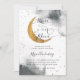 Dreamy gender neutral baby shower invitation card featuring watercolor art of grey sky with faux gold moon and stars. The text says "we're over the moon."