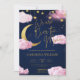 This "Over the Moon" baby shower invitation features a tranquil blue night sky, with a gold crescent moon and twinkling stars at the centre. Soft pink clouds surround the moon, creating a dreamy, whimsical vibe. The gold accents and pastel tones offer a perfect balance of elegance and charm, making it an ideal choice for a celestial-themed baby shower.