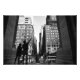 Black and white street photo of a couple standing on library steps in New York, pointing towards the city skyline, capturing a moment of wonder and connection