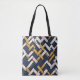 Overlapping geometric shapes in navy blue, white, and mustard yellow, creating a repeating diagonal pattern tote bag