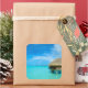 Souvenir sticker of a honeymoon overwater bungalow in a luxury resort in the clear blue lagoon of the pacific island of Bora Bora, near Tahiti in the French Polynesia archipelago.