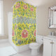 Shower curtain featuring a peony floral pattern from Owen Jones' A Study of Chinese Ornament. This pattern depicts peonies and other flowers on a rich yellow background.
