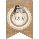 Super cute casual and rustic wedding design features a burlap texture look background on each of the flags. Some of the flags feature a white circle lace doily with two cute owls sitting on a branch at the top of the a beige inner circle. The owls are brown with light blue trim and light blue with beige trim. Inside these circles with the owls is customizable text to add your own wording and some can be customized with the couples first name initials. The rest of the flags have a plain white circle doily with text inside that spells out Just Married. Matching Owl Always Love You Casual Wedding Invitations and RSVP cards also available.