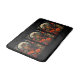 A bath mat with a cool looking owl with a piercing stare. A full moon in the back with a garden of red flowers.