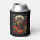 Can cooler with a cool looking owl with a piercing stare. A full moon in the back with a garden of red flowers.