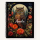 Spiral notebook with a cool looking owl with a piercing stare. A full moon in the back with a garden of red flowers.