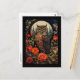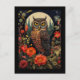 A postcard with a cool looking owl with a piercing stare. A full moon in the back with a garden of red flowers.