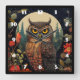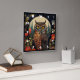 A clock with a cool looking owl with a piercing stare. A full moon in the back with a garden of red flowers.