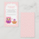 Encourage guests to bring a children's book for your little one with this cute request card insert which you can add to your invites. It has a cute pair of owls. The mother owl is reading a bedtime stories book to her baby owl which is wearing a night cap and which is snuggling nicely in the nest. A classic chevron zigzag pattern background and sweet colour choices of pink and purple makes it perfect for mums who are having baby girls.