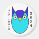 Imagine a small, round magnet with a clean white background. In the centre sits a vibrant blue owl, its feathers rich with varying shades of blue, from deep cobalt to lighter sky blue. The owl has large, piercing eyes giving it an alert and wise expression. Its wings are tucked neatly to its sides, while small details like white speckles or lighter blue accents decorate its body, adding texture. The owl's beak is sharp and pointed, possibly a contrasting colour like orange or black, standing out against the cool blues. Its feet are small, resting gently on the white surface of the magnet. The overall design is simple yet striking, with the contrast between the blue owl and the white background creating a charming and eye-catching visual.