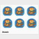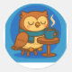 A glossy, vibrant round sticker featuring a cozy cartoon owl enjoying a steaming cup of coffee at a café table, set against a bold blue background. With kawaii styling, warm details, and crisp contrast, this design is perfect for planners, laptops, water bottles, and anyone who loves cute animals and coffee culture.