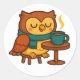 A glossy, vibrant round sticker featuring a cozy cartoon owl enjoying a steaming cup of coffee at a café table, set against a clean white background. With kawaii styling, warm details, and crisp contrast, this design is perfect for planners, laptops, water bottles, and anyone who loves cute animals and coffee culture.