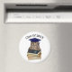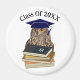 Cute picture of an owl wearing a graduation cap and standing next to a stack of books, is featured on this round magnet for graduation. With message, "Class of 20XX", you can change the year. Use as a decoration or give as a small keepsake gift to the graduate in the family!